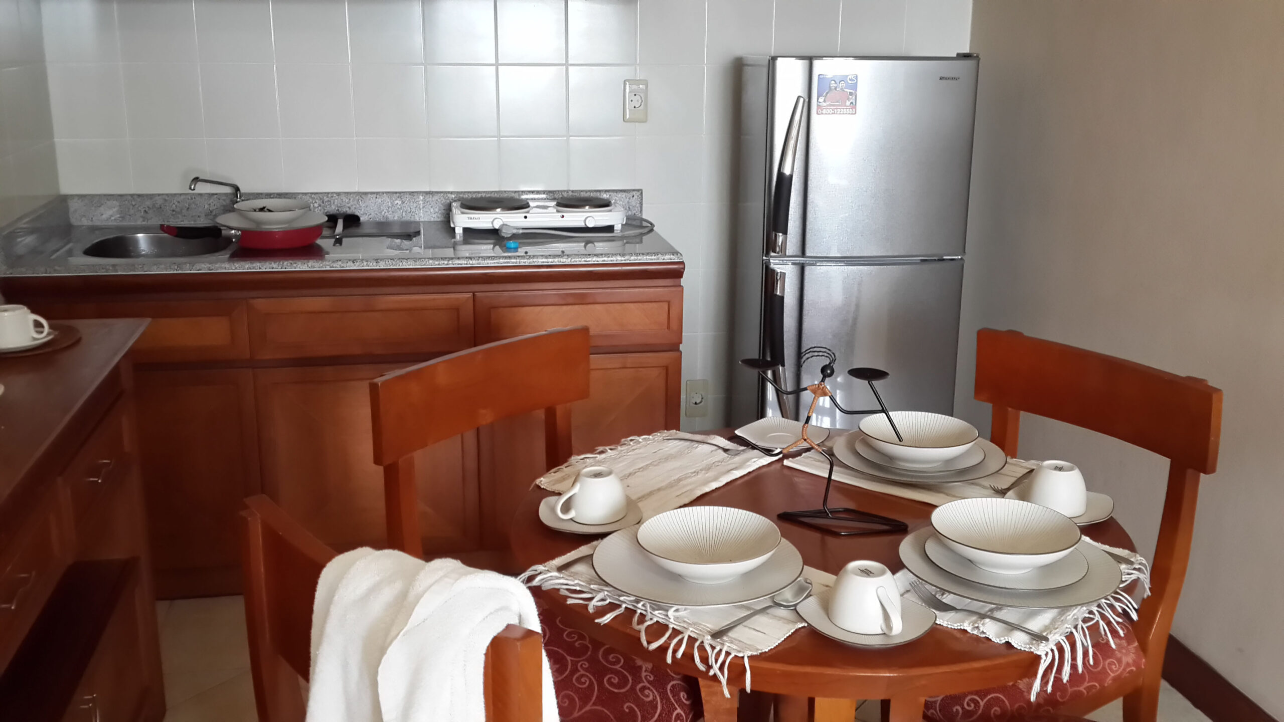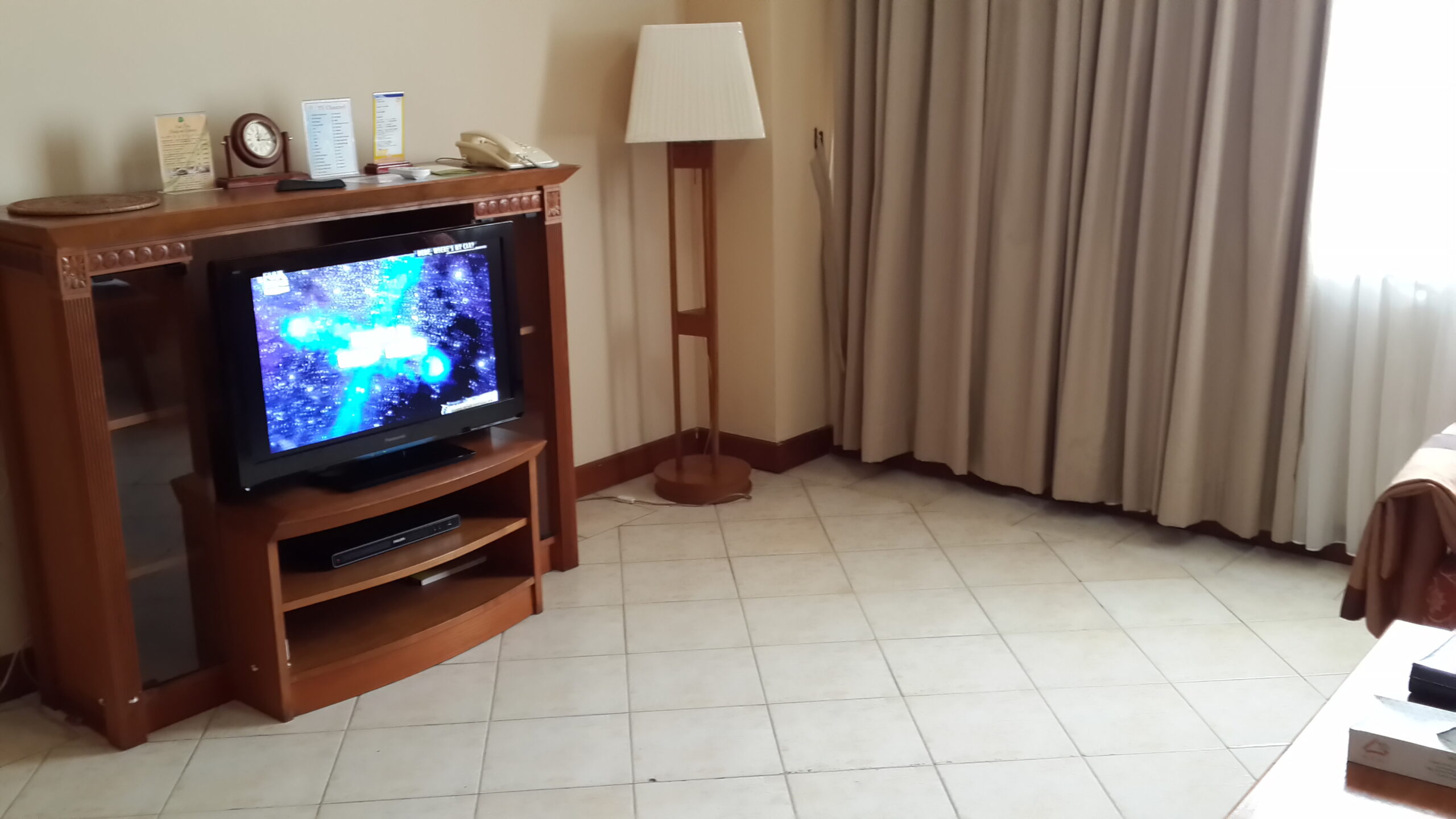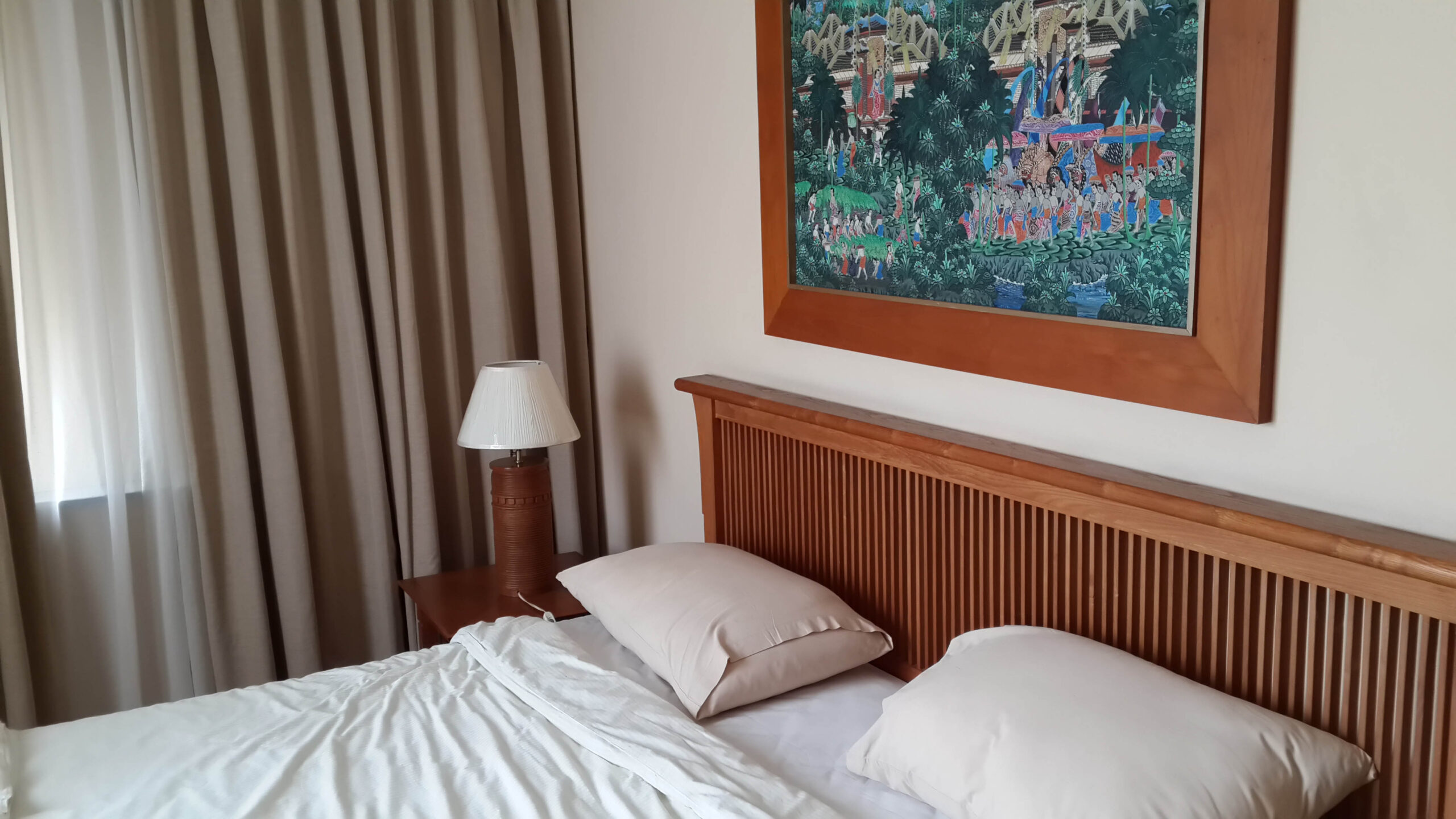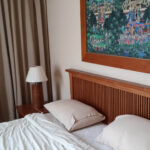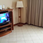 Setelah bertanya kepada resepsionis Delonix, ternyata di Delonix tidak ada kolam renang. Hanya ada tempat mandi air panas. Jelas bukan pilihan anak-anak. Coret. Akhirnya balik ke Puri KIIC, dan mengambil kamar yang bertarif 1.3 jt. Kamarnya SANGAT BESAR. Ada dua pintu kamar di dalam kamar itu. Ada dapur dan ruang tamu. Jadi ada 3 AC dengan 3 merek berbeda di pasang. Satu di ruang tamu, satu di kamar tidur (single bed untuk satu orang), dan satu lagi single bed King Size. Wifi terpasang dengan kencang, ada 2 TV. 1 di ruang tidur utama dan satunya di ruang tamu. Kamar mandi ada bath tub dan shower. Tempat masak dilengkapi kompor listrik dan tempat minum galon air mineral. Ada meja makan full dining setnya.