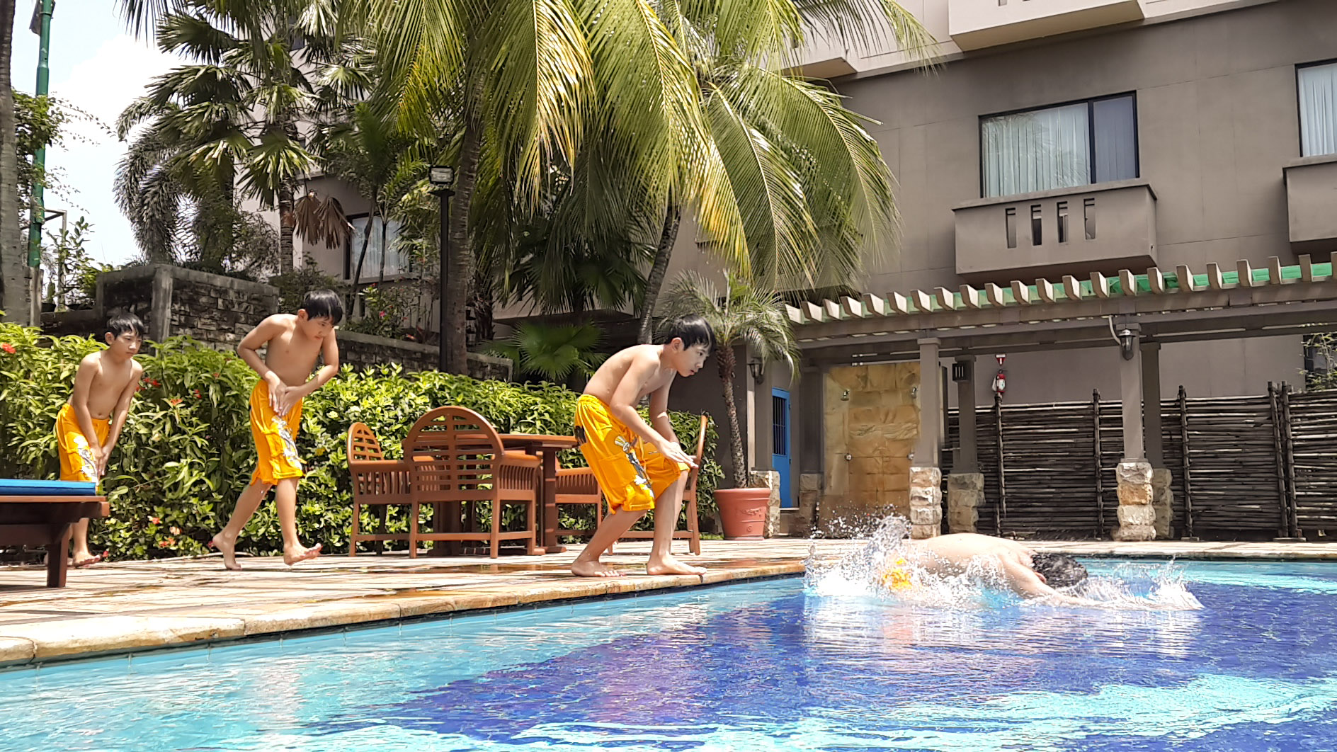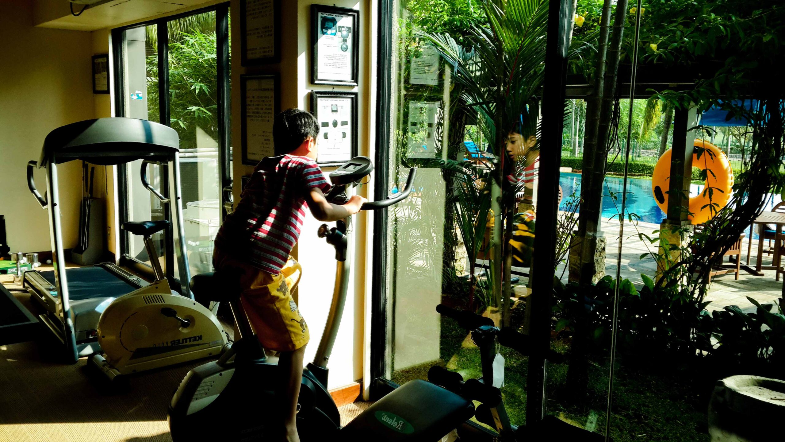 Sabtu paginya, setelah sarapan, saya dan Rayyan berolahraga di fitness center, mencoba pingpong, mini golf, sepeda, dsb. Setelah itu kami berdua berenang di kolam renangnya yang bersih. Berikut ini adalah foto-foto yang diambil di sekitar hotel.