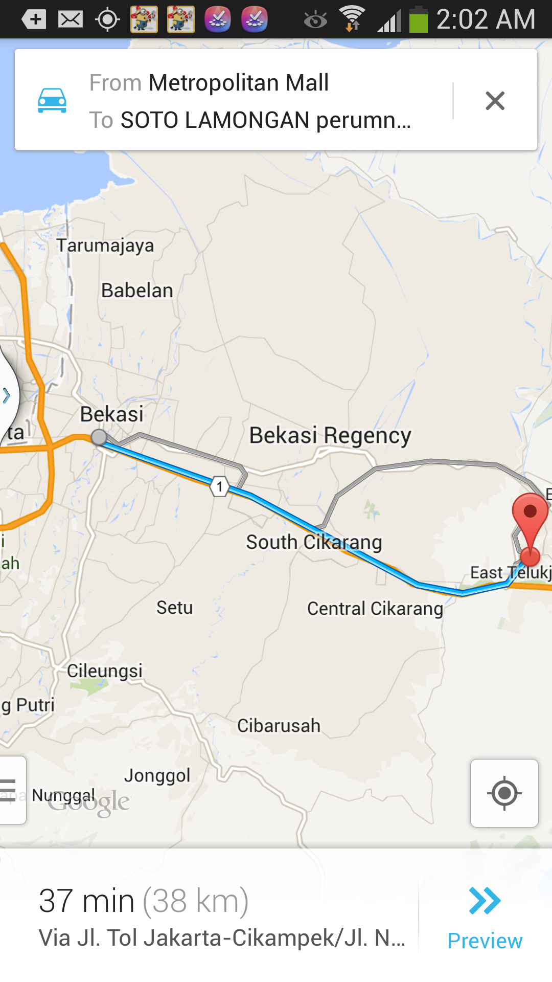 Hmm.. di Google Maps muncul Soto Lamongan Perumnas Teluk Jambe. Biarin deh menujunya Soto Lamongan itu. Pikir-pikir yang penting kalau dapat sotonya pasti dapat perumahannya hehehe.. The worst case minta dijemput ke tempat sotonya sambil nyoto hahaha.. Dan ternyata Google Maps dari Samsung S4ku cukup akurat untuk menunjukkan arah, termasuk kapan mesti belok kanan dan belok kiri. Termasuk peringatan 100 meter sebelumnya dan berikutnya akan belok ke mana. Bila saran Google Maps tidak kita acuhkan, misal dia bilang kita harus belok kiri tapi malah terus (misal jalannya di verboden), maka ia akan membuat rute baru ke tempat tujuan dari posisi kita yang terbaru. Fitur yang cerdas.