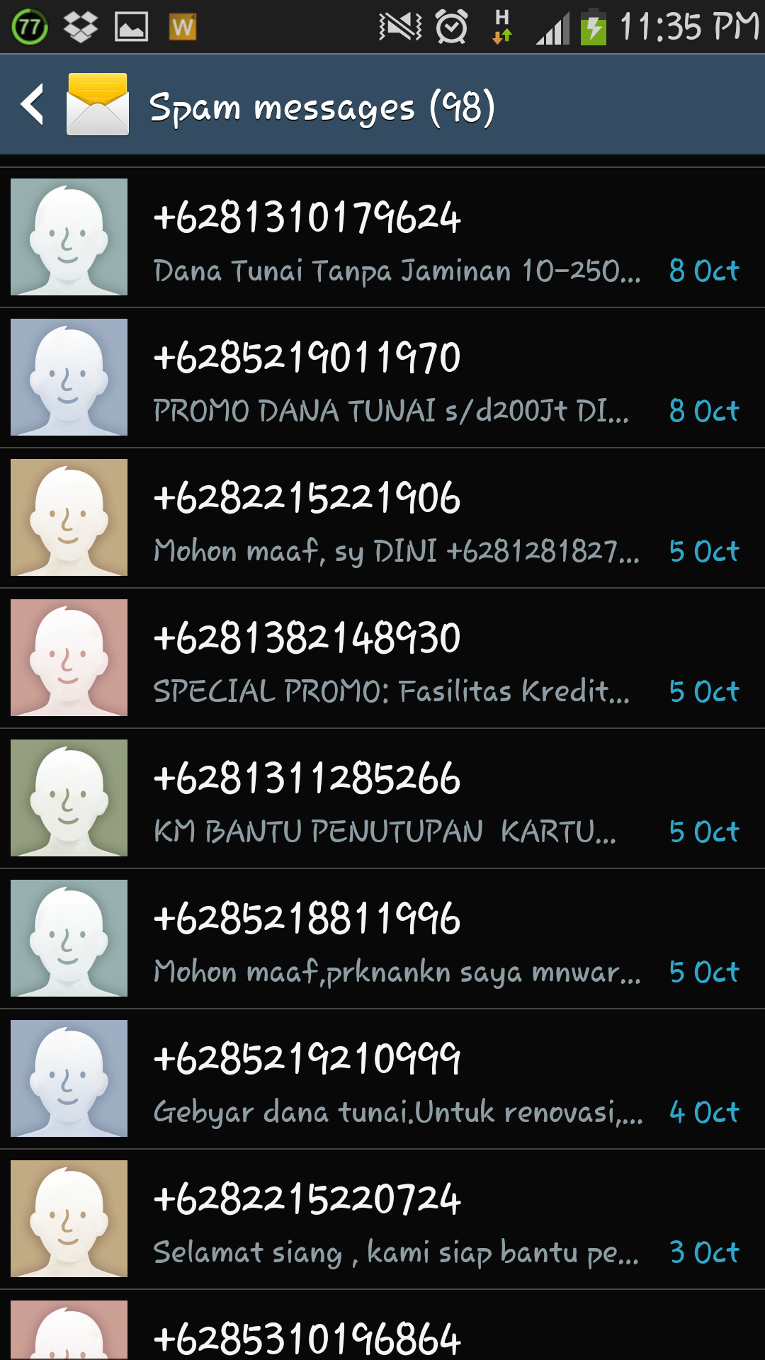 Terakhir, di Samsung Galaxy S4. Untungnya mobile phone Android dari Samsung ini memiliki fitur anti SPAM built in. Jadi bukan install third party software. Menurut saya ini langkah cerdas, karena anti spam SMS seperti ini seharusnya ditangani di level OS atau aplikasi bawaan smart phonenya. Blokir nomor telpon atau SMS bisa berdasarkan nomor pengirim atau berdasarkan frase tertentu. Pesan yang terkena filter juga dikarantina dalam folder SPAM sehingga bila ada pesan baik yang terfilter tidak sengaja, masih bisa dikembalikan ke Inbox. SMART!