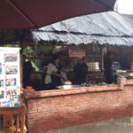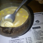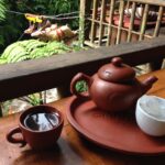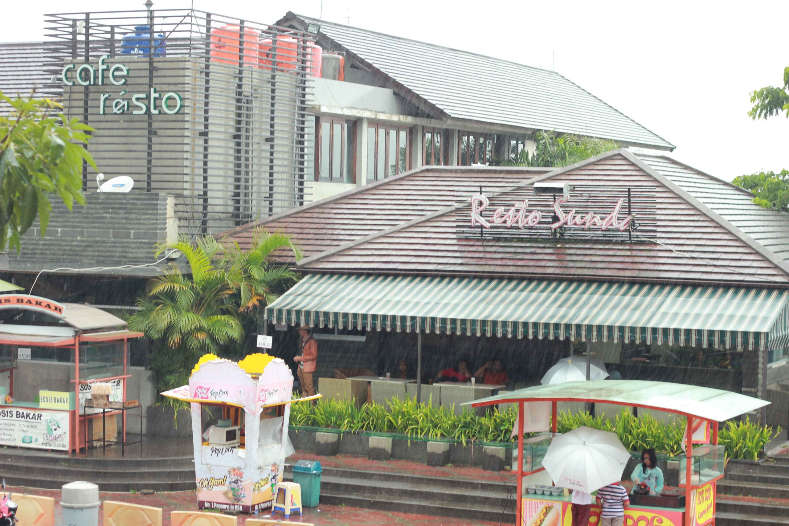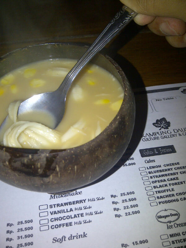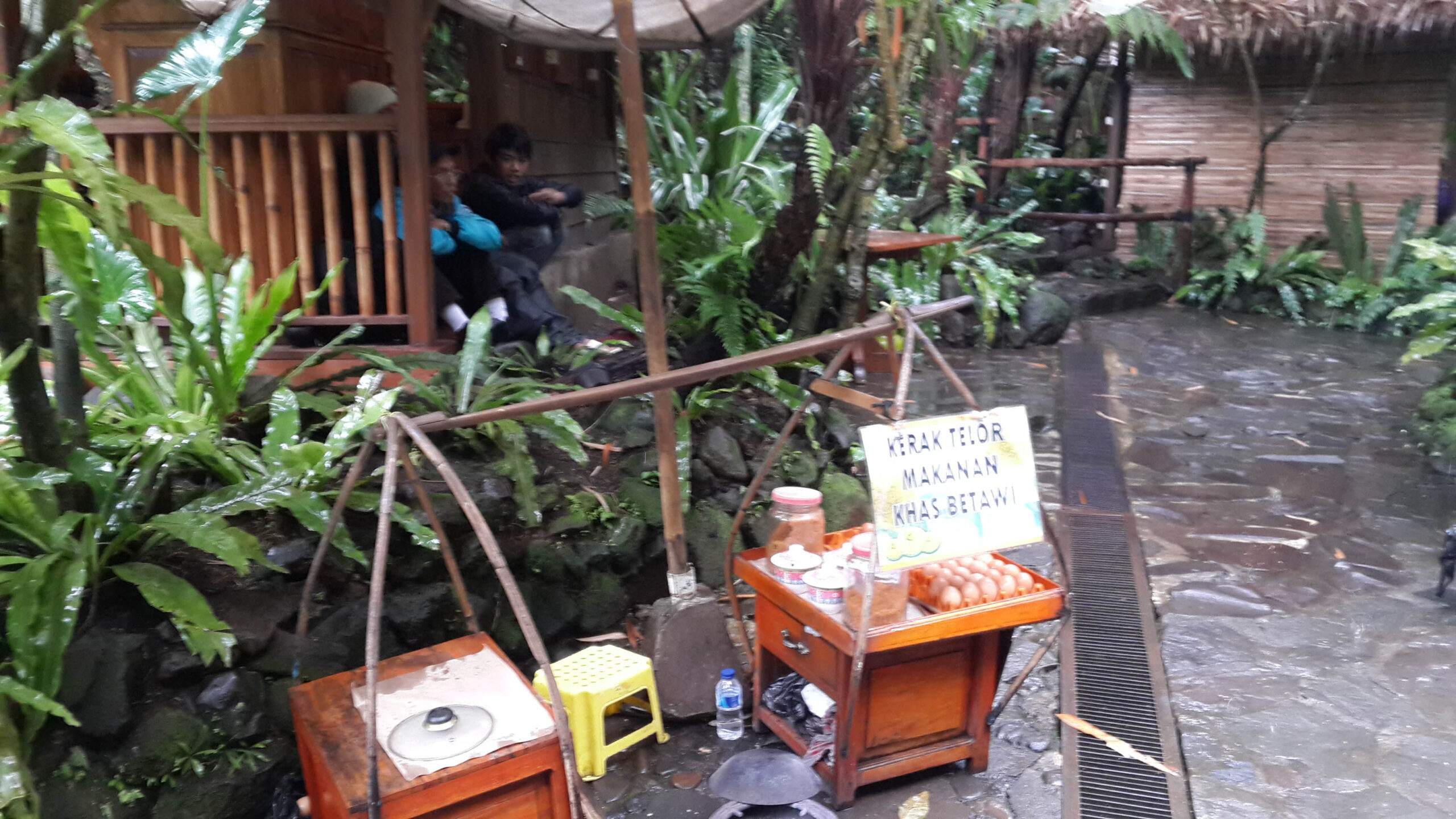 Setelah itu kami cabut untuk makan siang di Kampung Daun. Begitu parkir dan mencoba reservasi, menunggu antrian ke-10. Akhirnya sambil menunggu reservasi saya memesan 3 kerak telor, bala-bala, ketan bakar, pisang aroma, dan segelas bandrek. Suhu yang dingin dibalut hujan yang tak berhenti dibalas dengan kenikmatan bandrek hangat dengan kelapa dan jagung muda. Rasanya AMAZING.