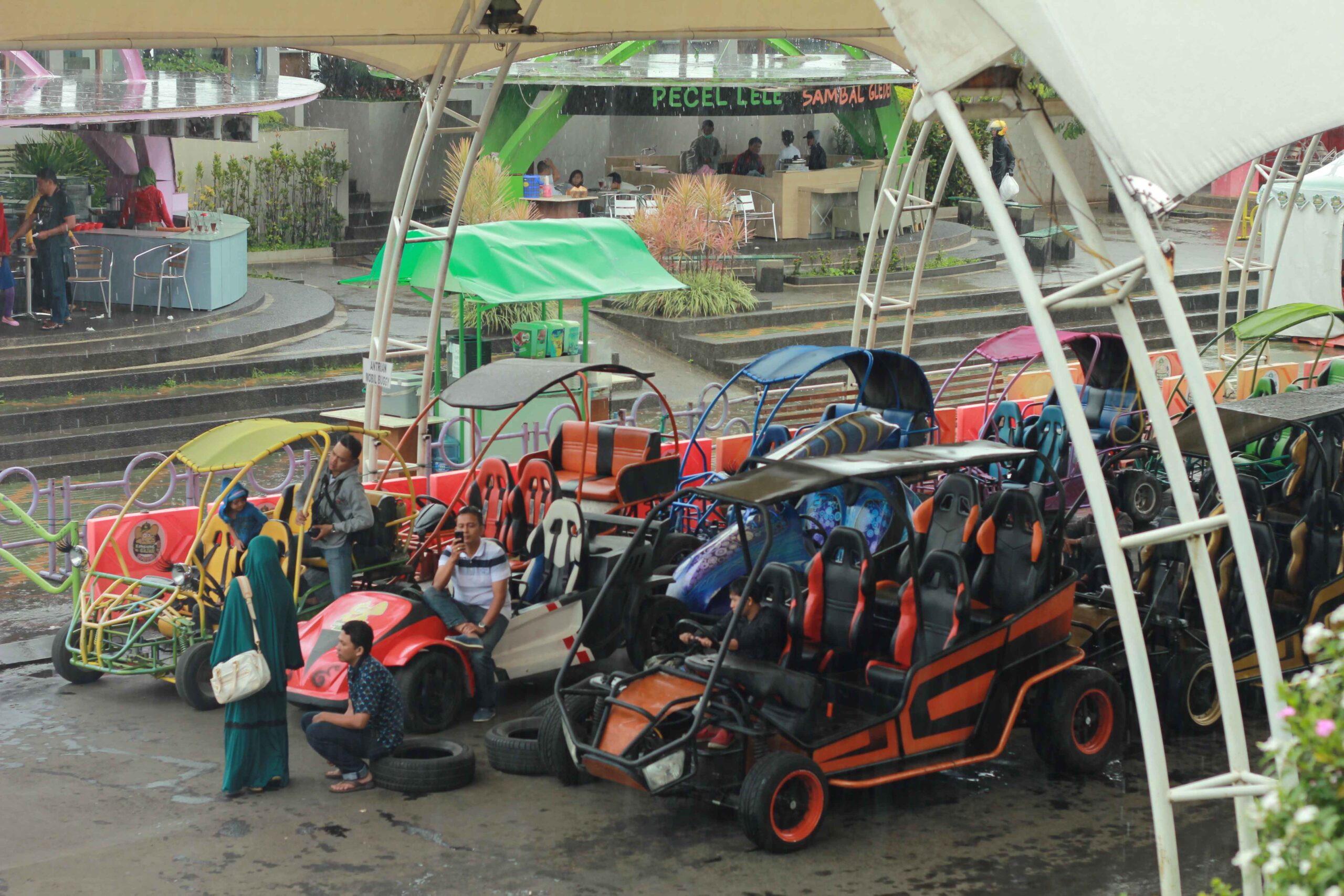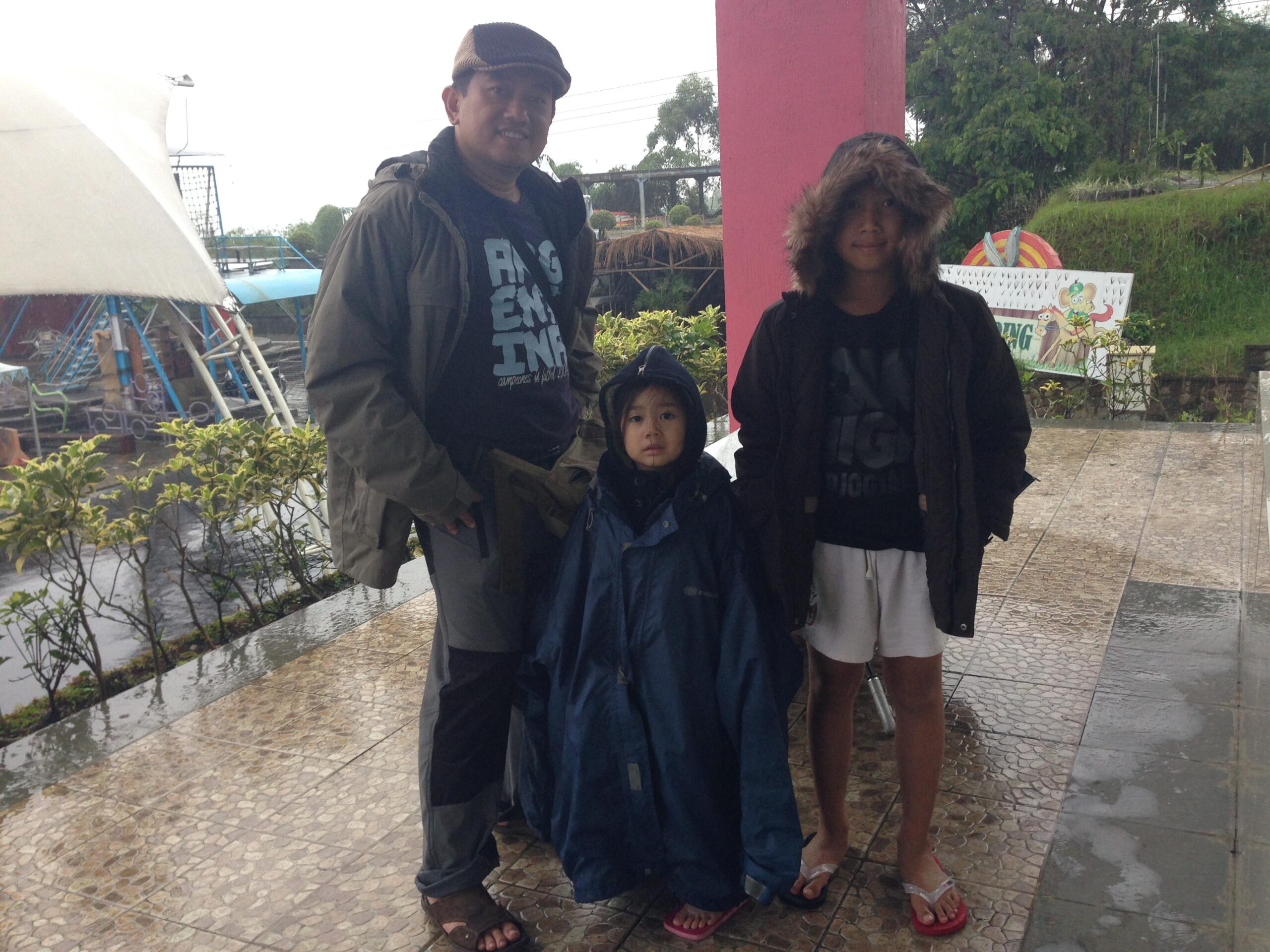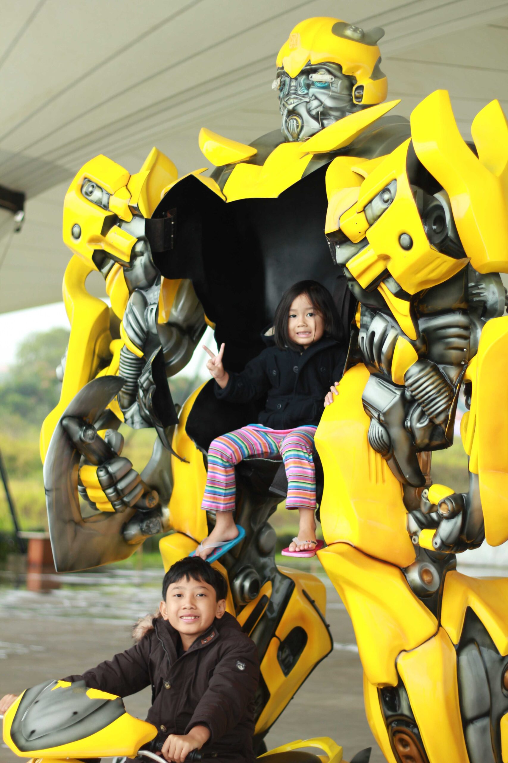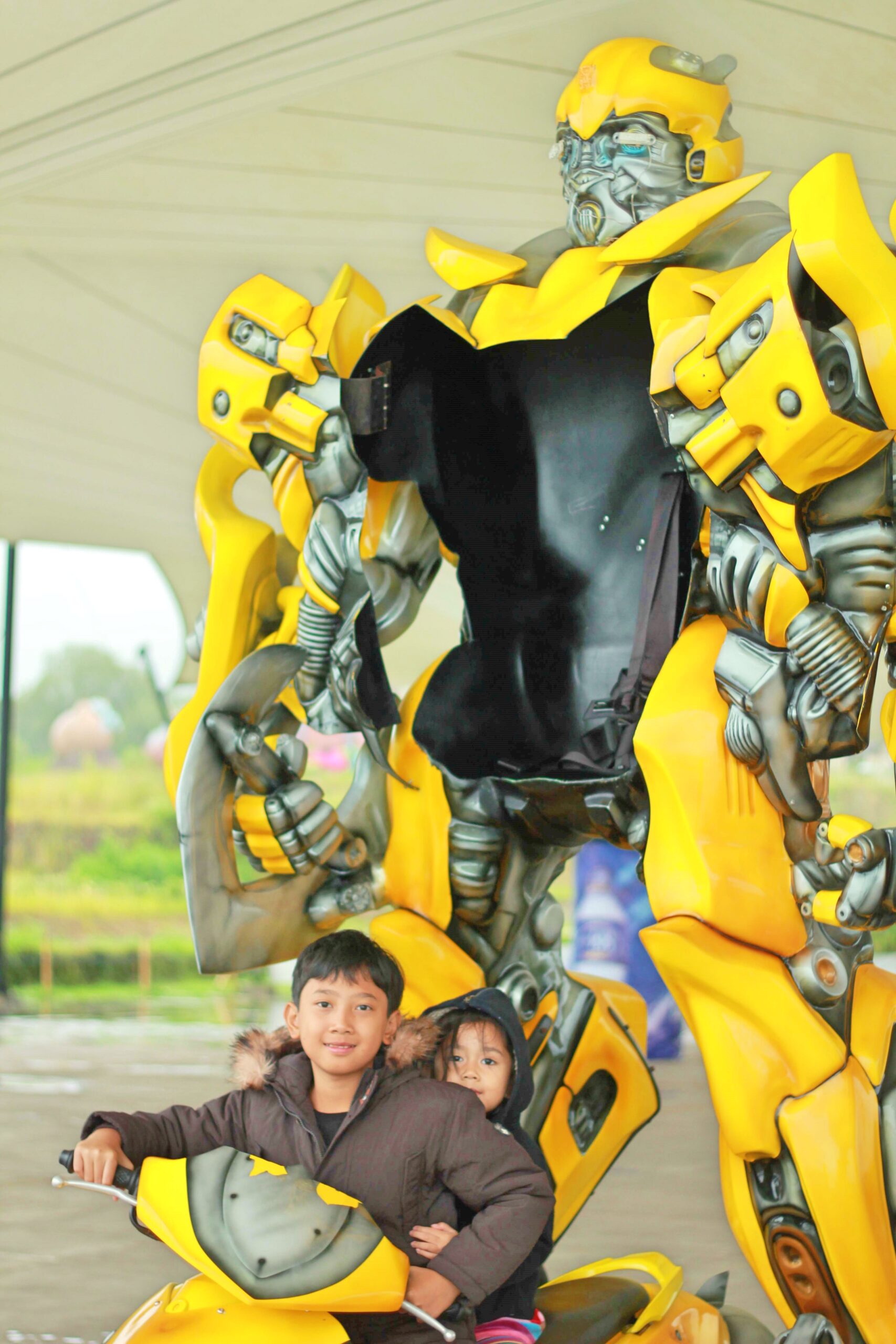 Paginya setelah sarapan mereka berenang lagi di hotel setelah sarapan. Akhirnya keluar hotel pas check out dan langsung ke Kampung Gajah. Sayang di sana hujan terus sehingga sebagian besar permainan outdoor tidak dioperasikan. Akhirnya kami hanya mencoba naik robot Bumblebee (sangat tidak sepadan dengan harganya, 150 ribu rupiah hanya untuk 2 putaran). Mesinnya dari motor Mio yang tidak bertenaga dengan beban berat di atasnya. Menurut saya, tidak perlu dicoba. Anak-anak sih senang. Tapi harganya semahal itu, sangat tidak layak untuk dicoba. Yang kedua kami mencoba Rumah Teror, di man pengunjung wahana naik kereta di atas rel masuk ke ruangan super gelap, dengan boneka, pocong, dan petugas berpakaian yang mencoba menakut-nakuti kami. Sebagai penggemar film Conjuring dan Insidious, wahana ini tampak menggelikan ali-alih menakutkan. Hanya saya dan Rayyan yang mencoba. Aila dan mamahnya lihat-lihat baju di toko. Tipikal para wanita. Sigh.