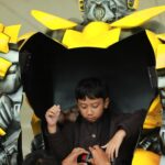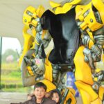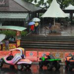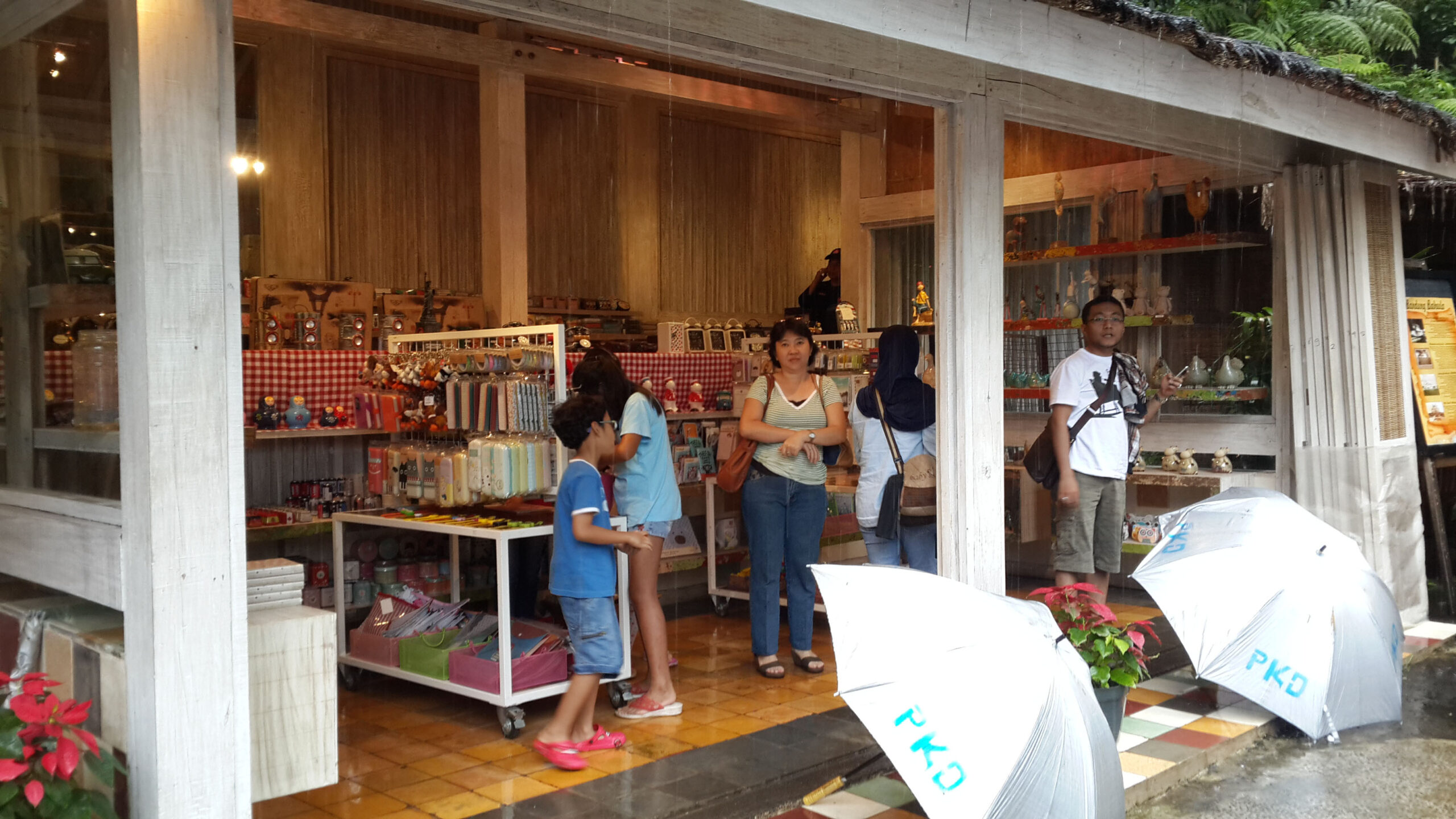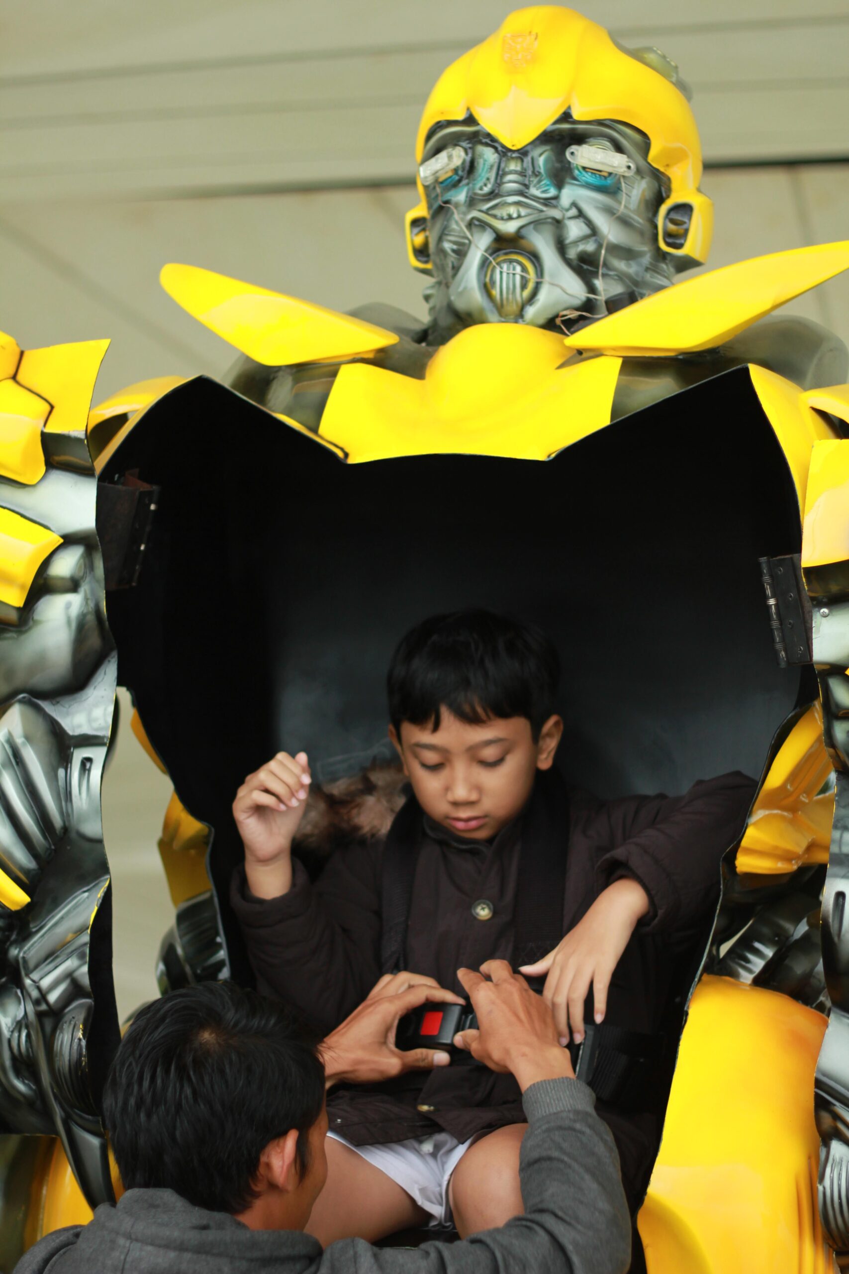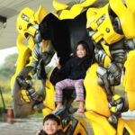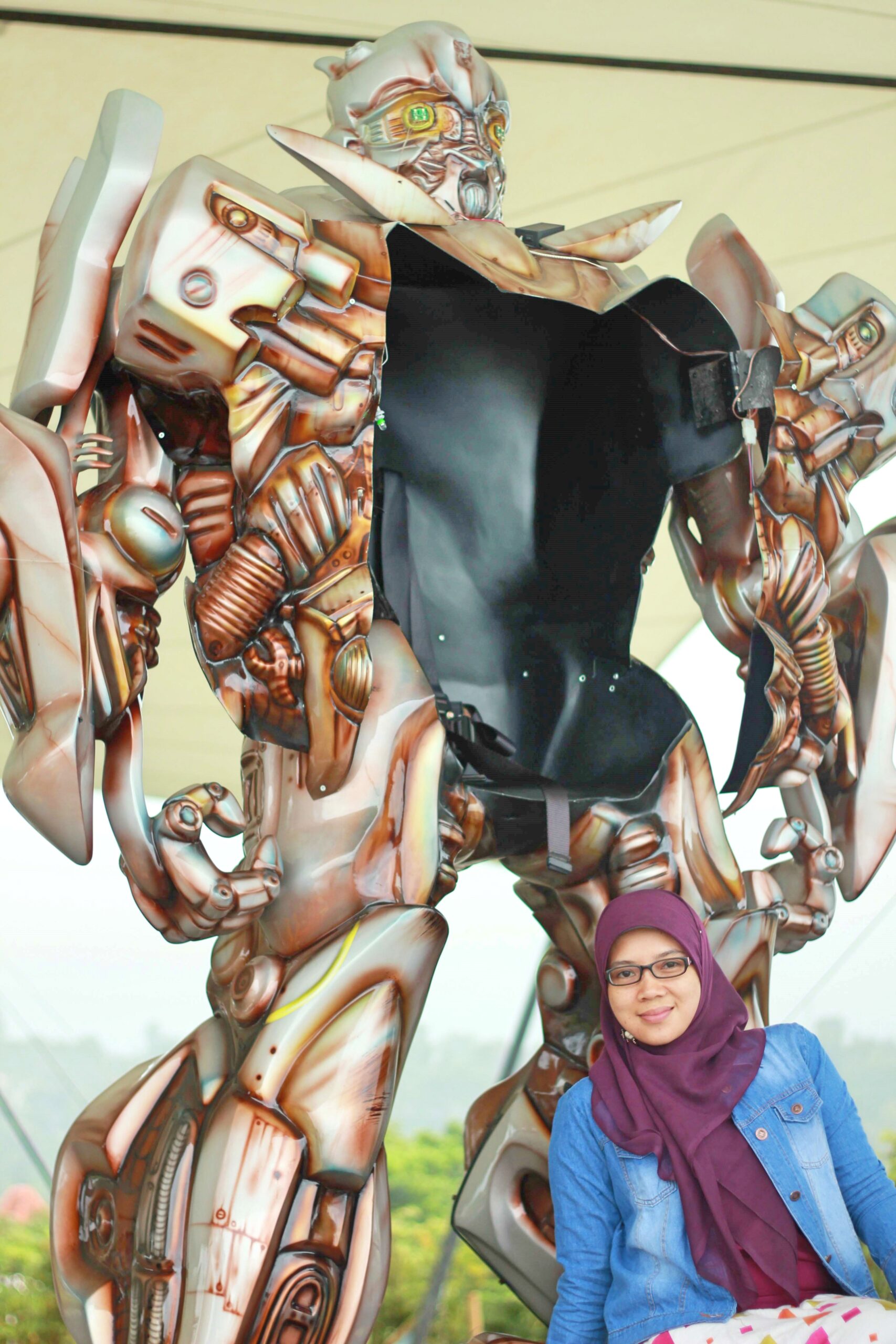 Paginya setelah sarapan mereka berenang lagi di hotel setelah sarapan. Akhirnya keluar hotel pas check out dan langsung ke Kampung Gajah. Sayang di sana hujan terus sehingga sebagian besar permainan outdoor tidak dioperasikan. Akhirnya kami hanya mencoba naik robot Bumblebee (sangat tidak sepadan dengan harganya, 150 ribu rupiah hanya untuk 2 putaran). Mesinnya dari motor Mio yang tidak bertenaga dengan beban berat di atasnya. Menurut saya, tidak perlu dicoba. Anak-anak sih senang. Tapi harganya semahal itu, sangat tidak layak untuk dicoba. Yang kedua kami mencoba Rumah Teror, di man pengunjung wahana naik kereta di atas rel masuk ke ruangan super gelap, dengan boneka, pocong, dan petugas berpakaian yang mencoba menakut-nakuti kami. Sebagai penggemar film Conjuring dan Insidious, wahana ini tampak menggelikan ali-alih menakutkan. Hanya saya dan Rayyan yang mencoba. Aila dan mamahnya lihat-lihat baju di toko. Tipikal para wanita. Sigh.