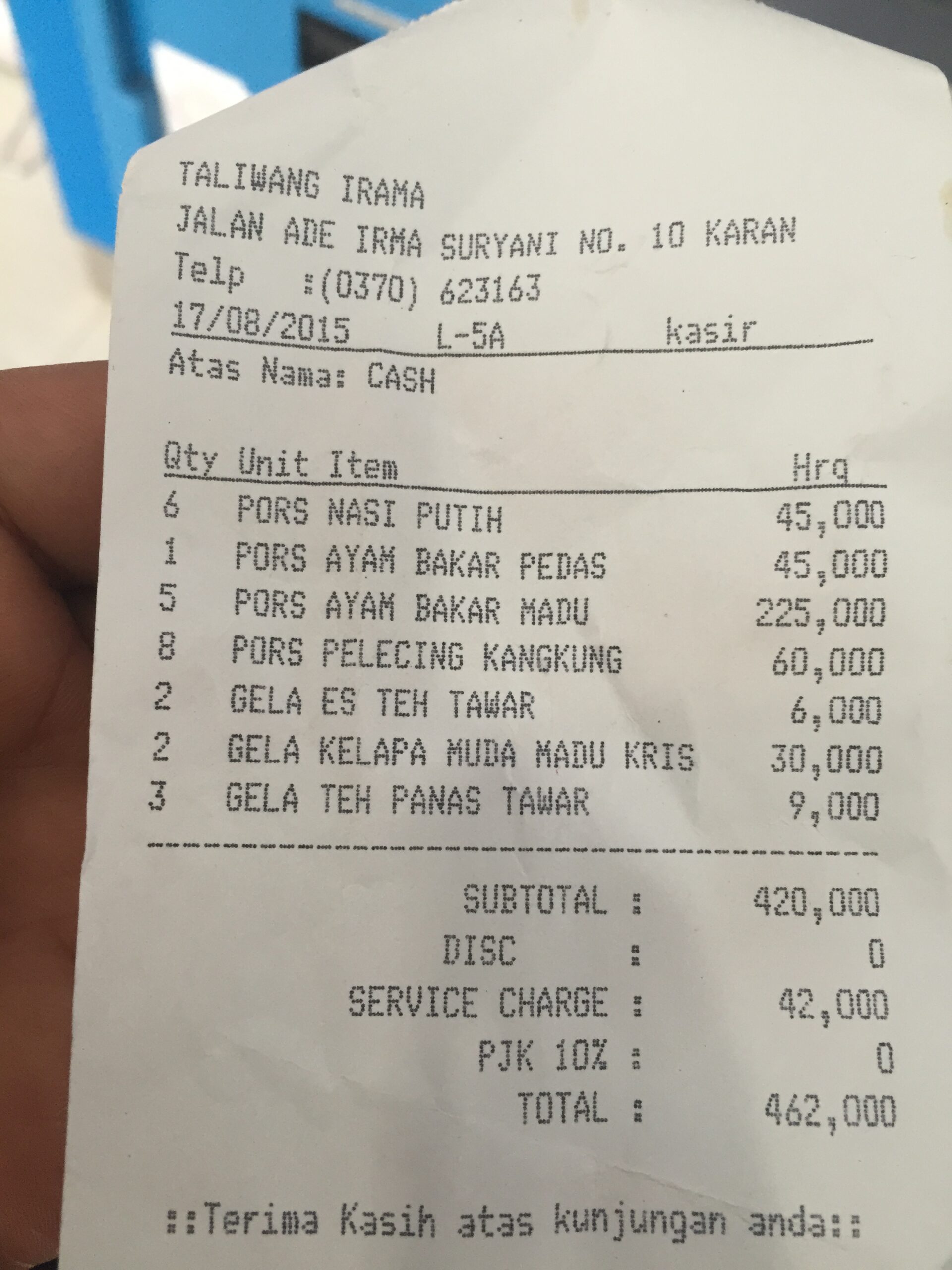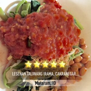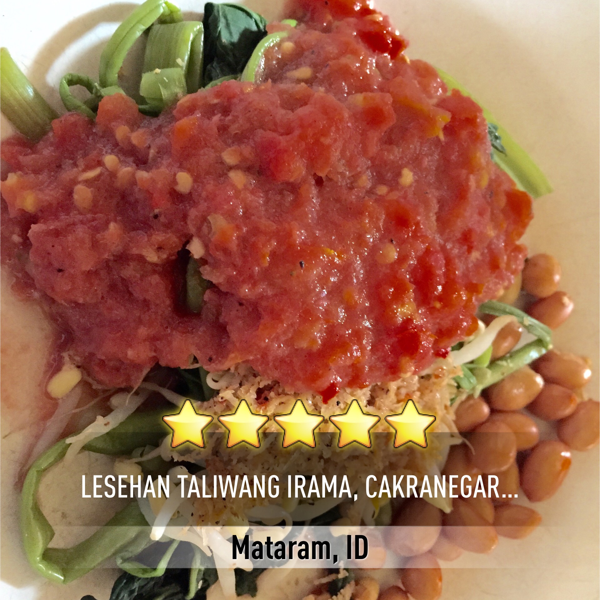 Karena di Lombok, saya mencari ayam taliwang yang paling enak di Mataram. Setelah bertanya pada penduduk lokal, taliwang yang juicy ada di Taliwang Irama, sedangkan yang lebih kering ada di Kania. Karena kami lebih suka yang lebih juicy, akhirnya dengan bantuan Waze kami berhasil mencari rumah makan lesehan tersebut. Beberuk dan Plecing Kangkungnya segar dan nikmat. Alhamdulillah nikmatnya.