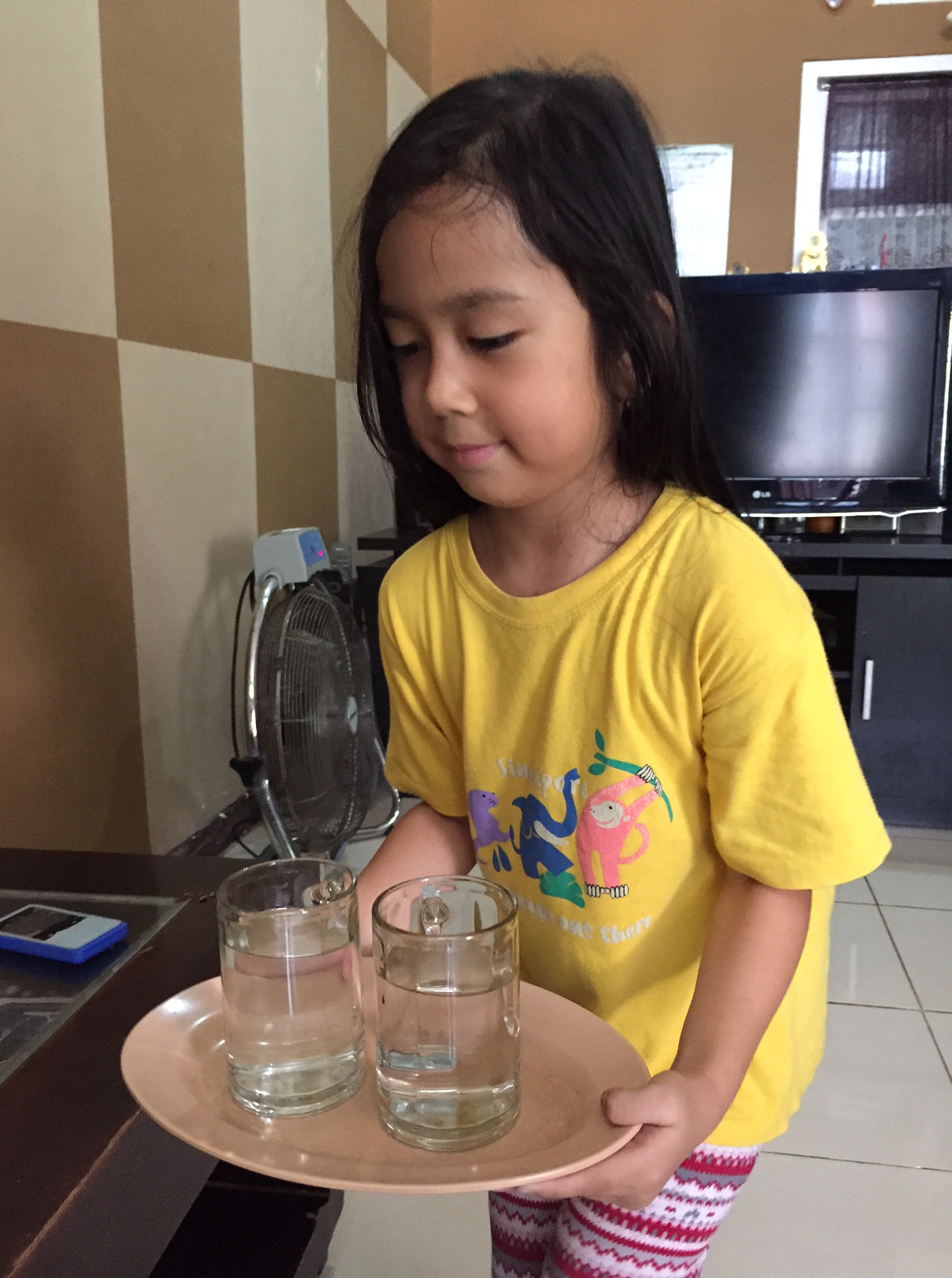 I present you my daughter bringing two glasses of water. A task which is required her to be careful. Otherwise disaster may happen 🙂
