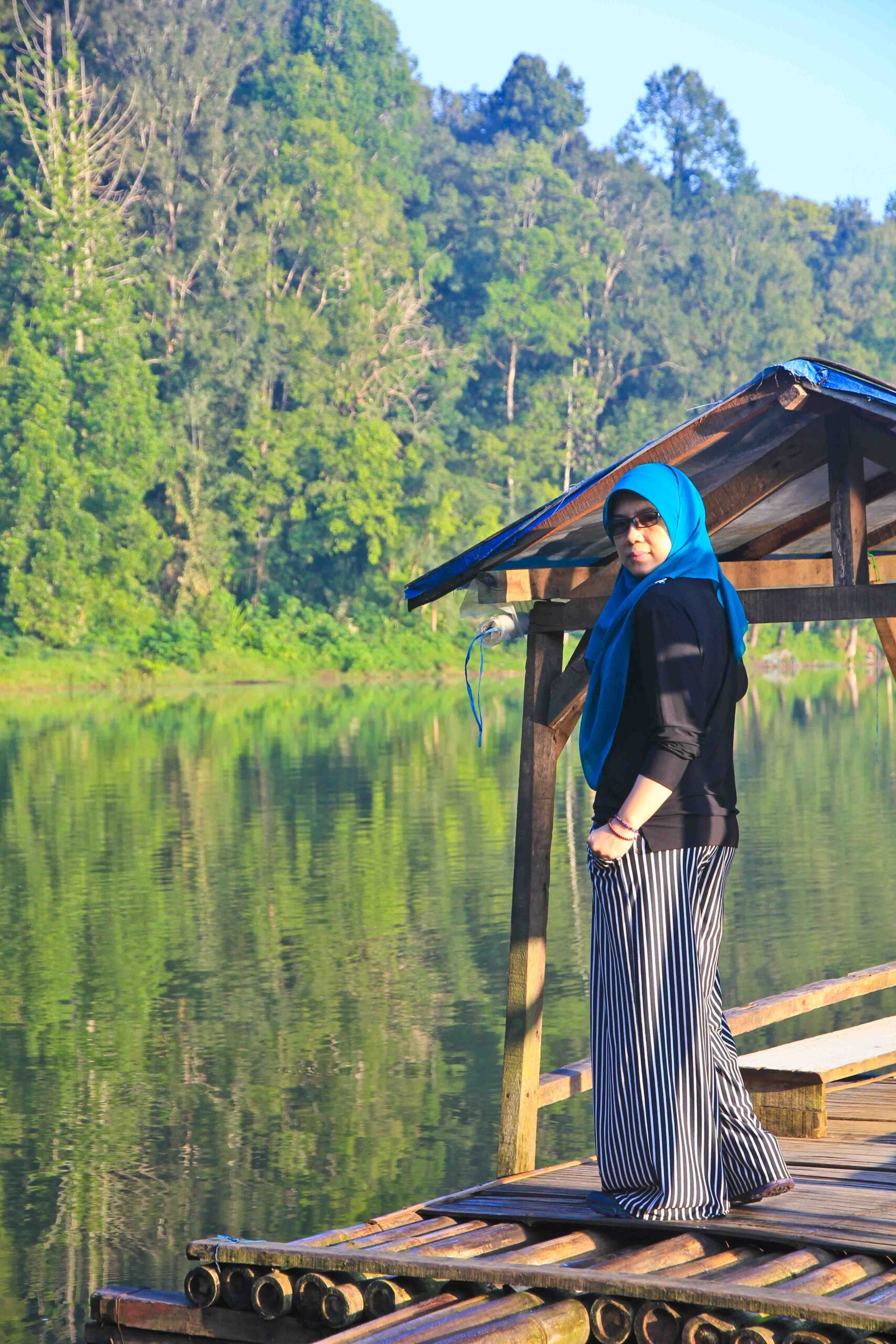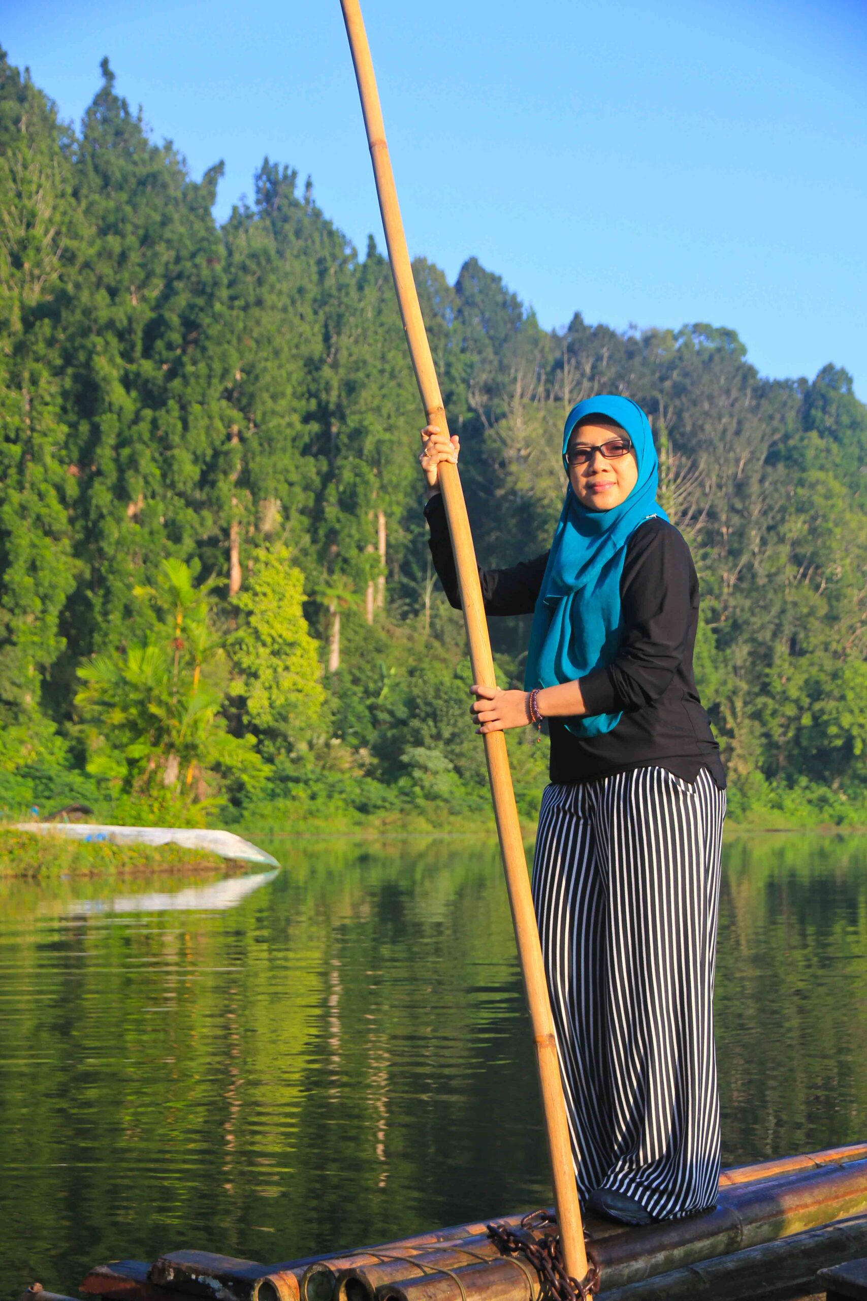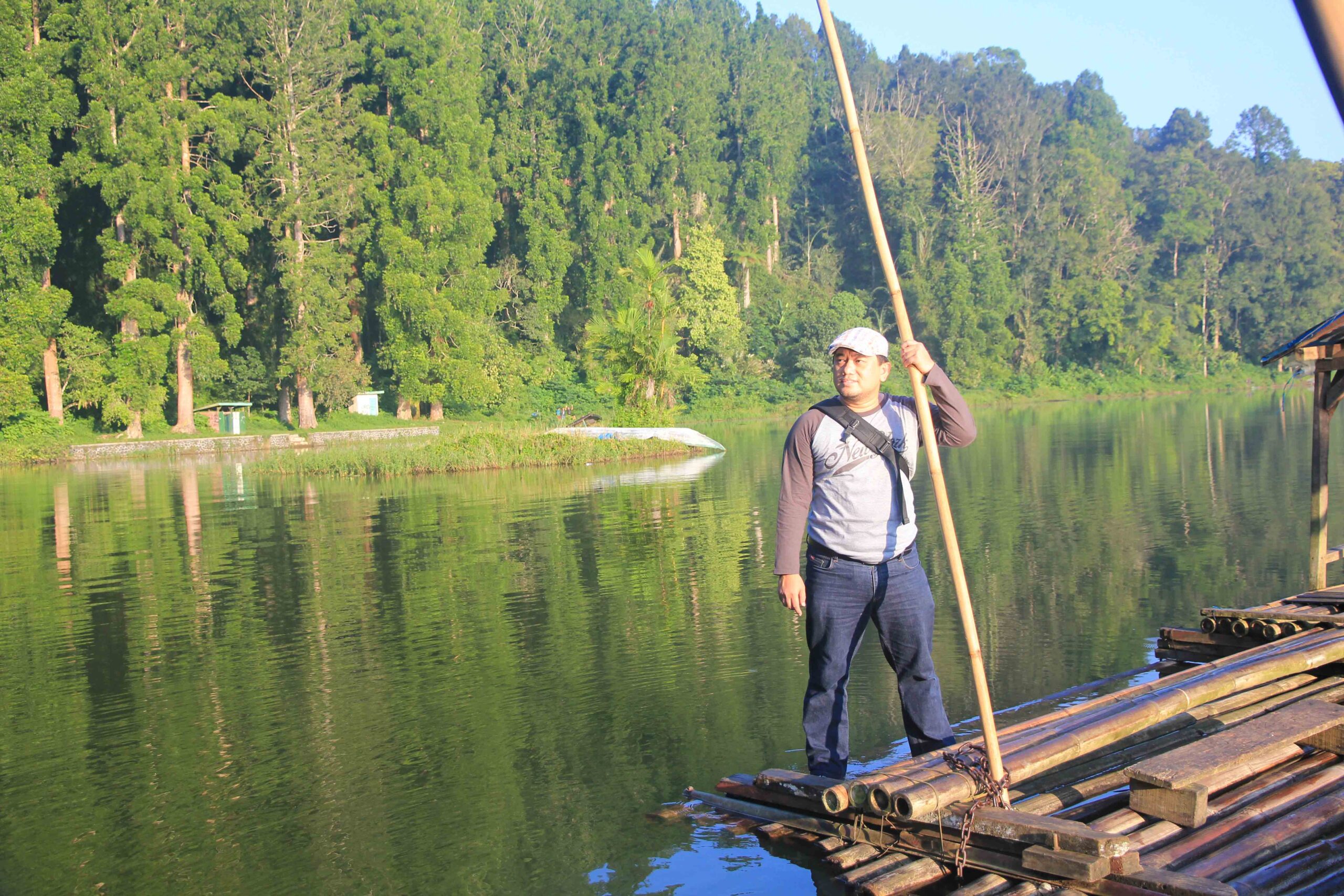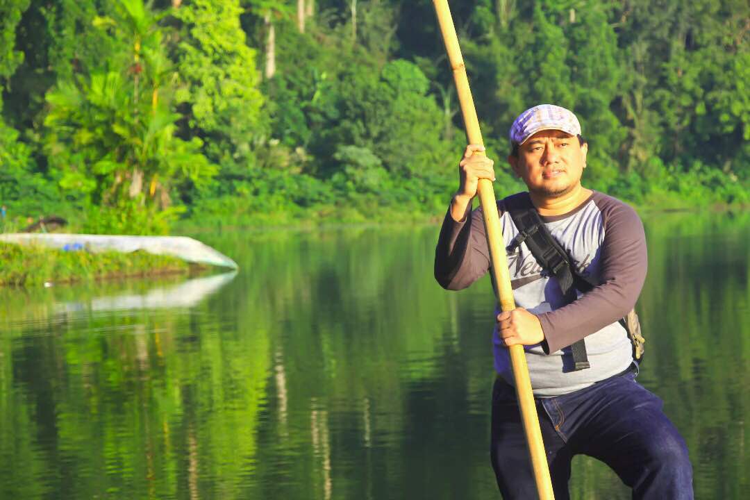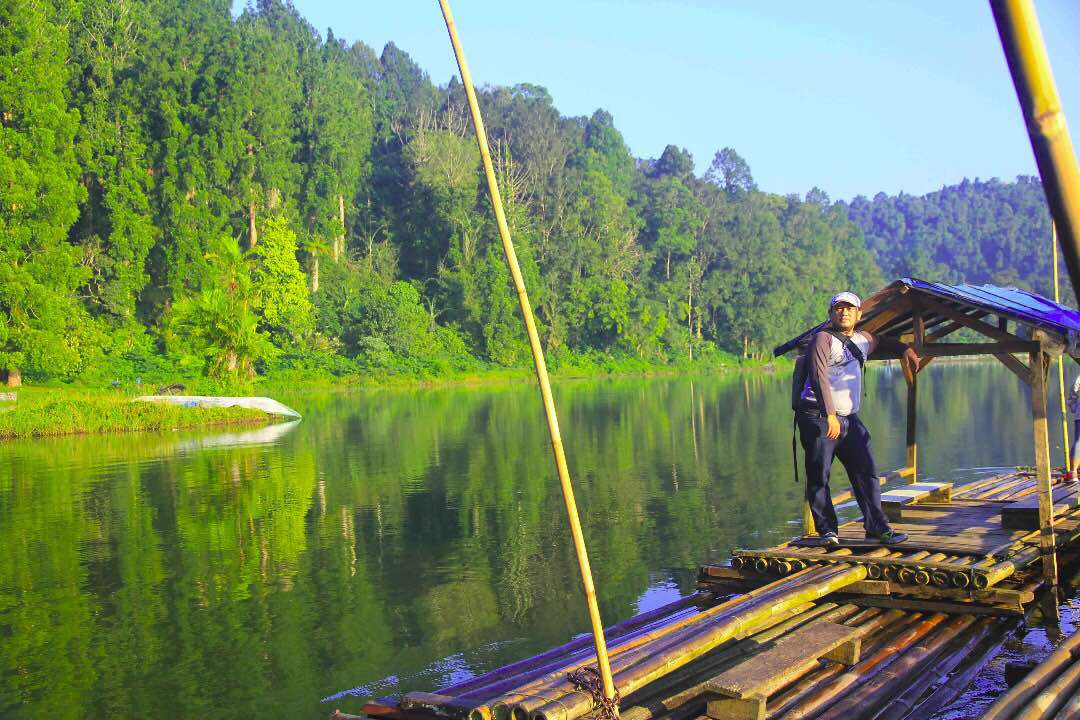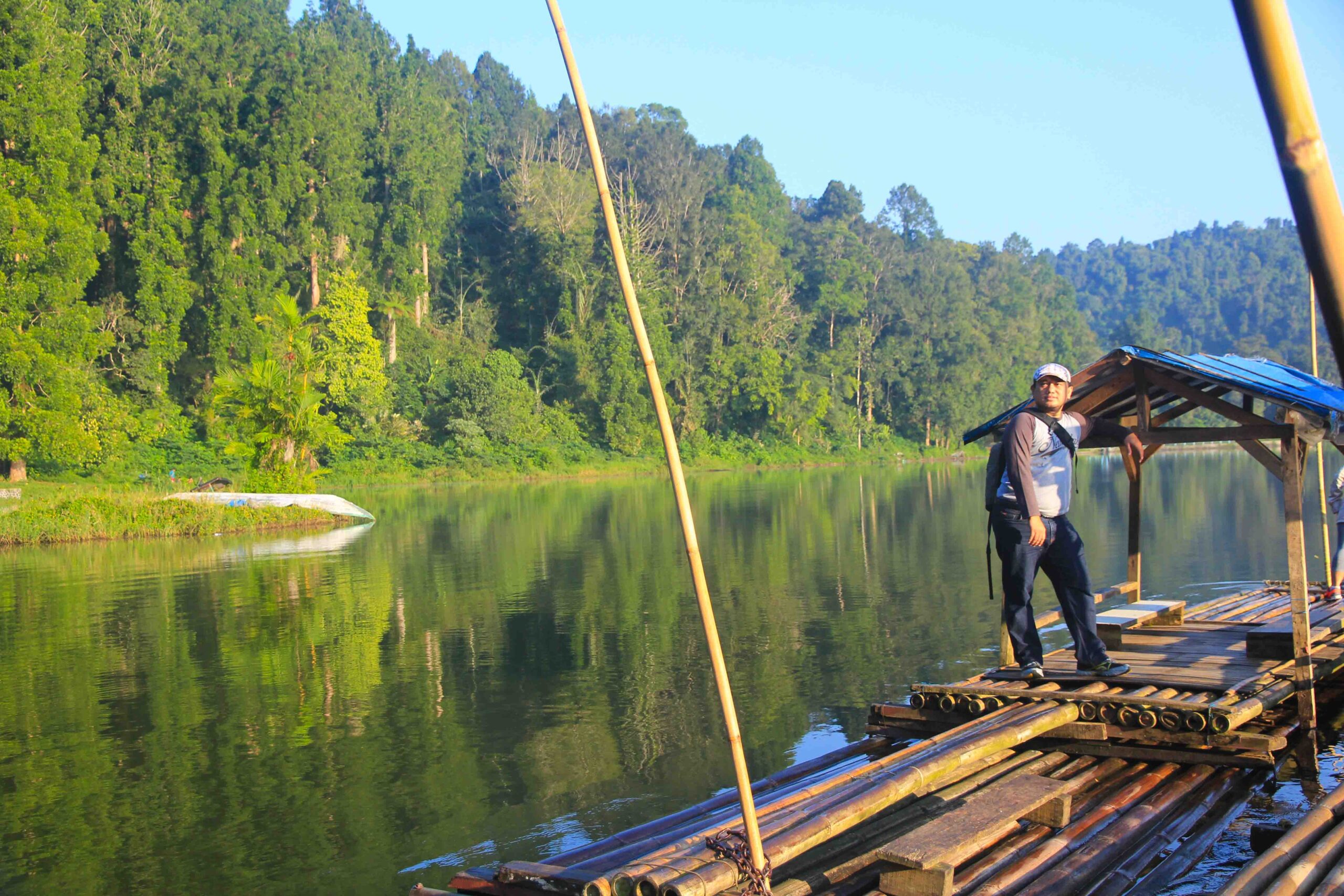 Oh ya, gambar di atas ada gambar Pak Miftah, orang tua yang mengenakan ikat kepala. Dia yang mengoperasikan rakit bambu dengan tarif 15 ribu per orang. Kalau mengambil foto di atas rakitnya, kasihlah barang sedikit uang untuk keluarganya.
