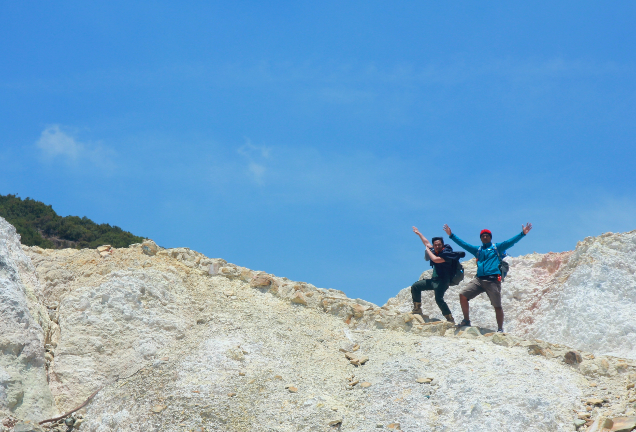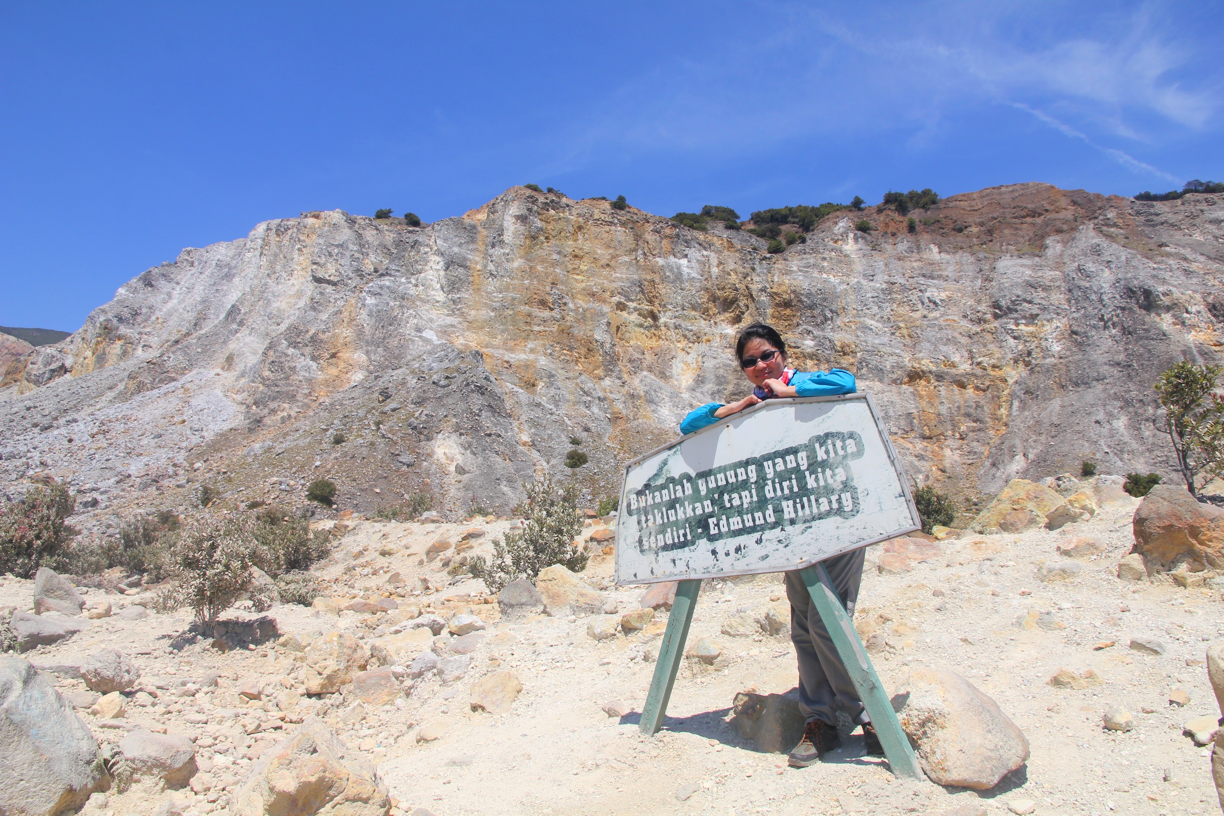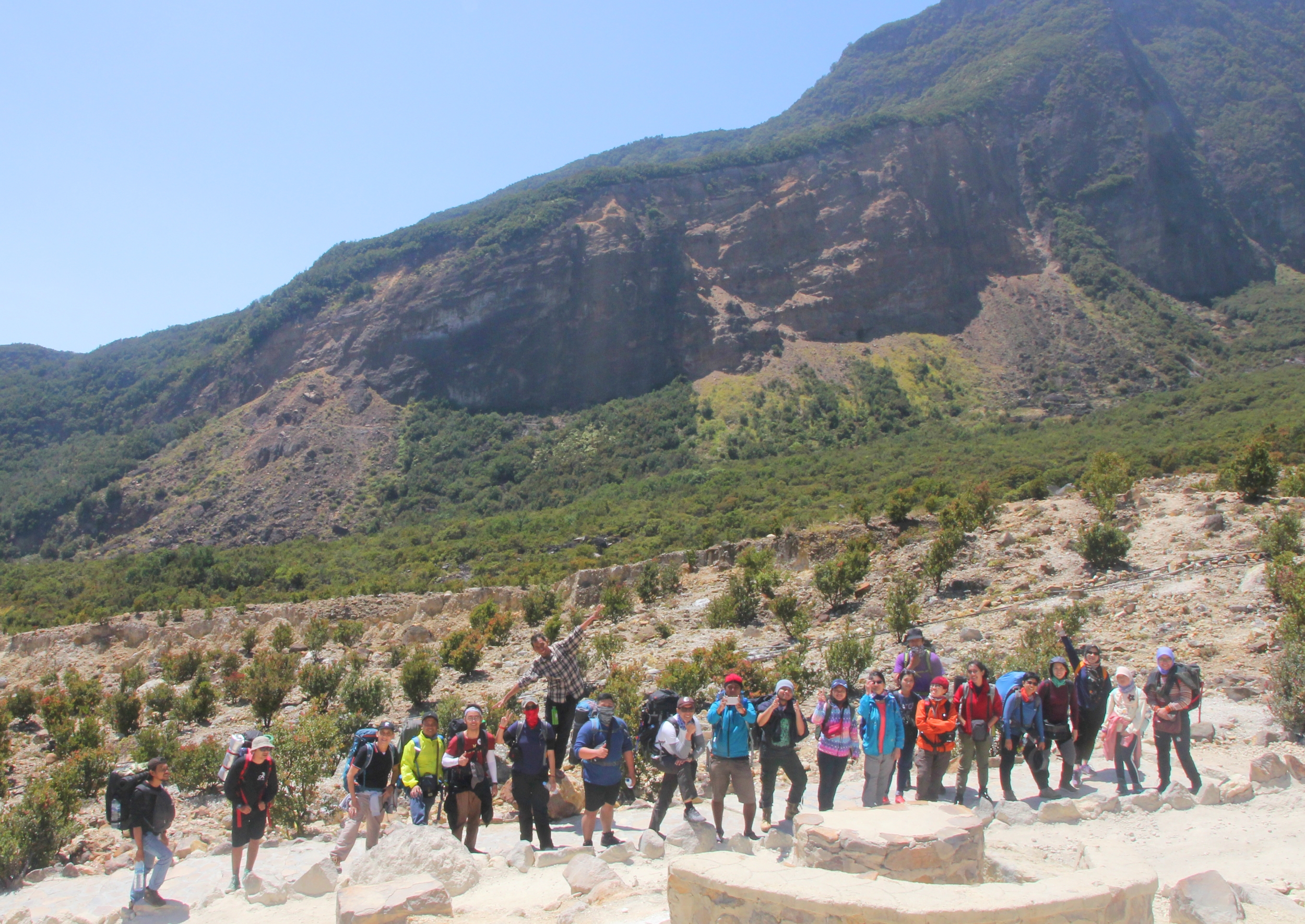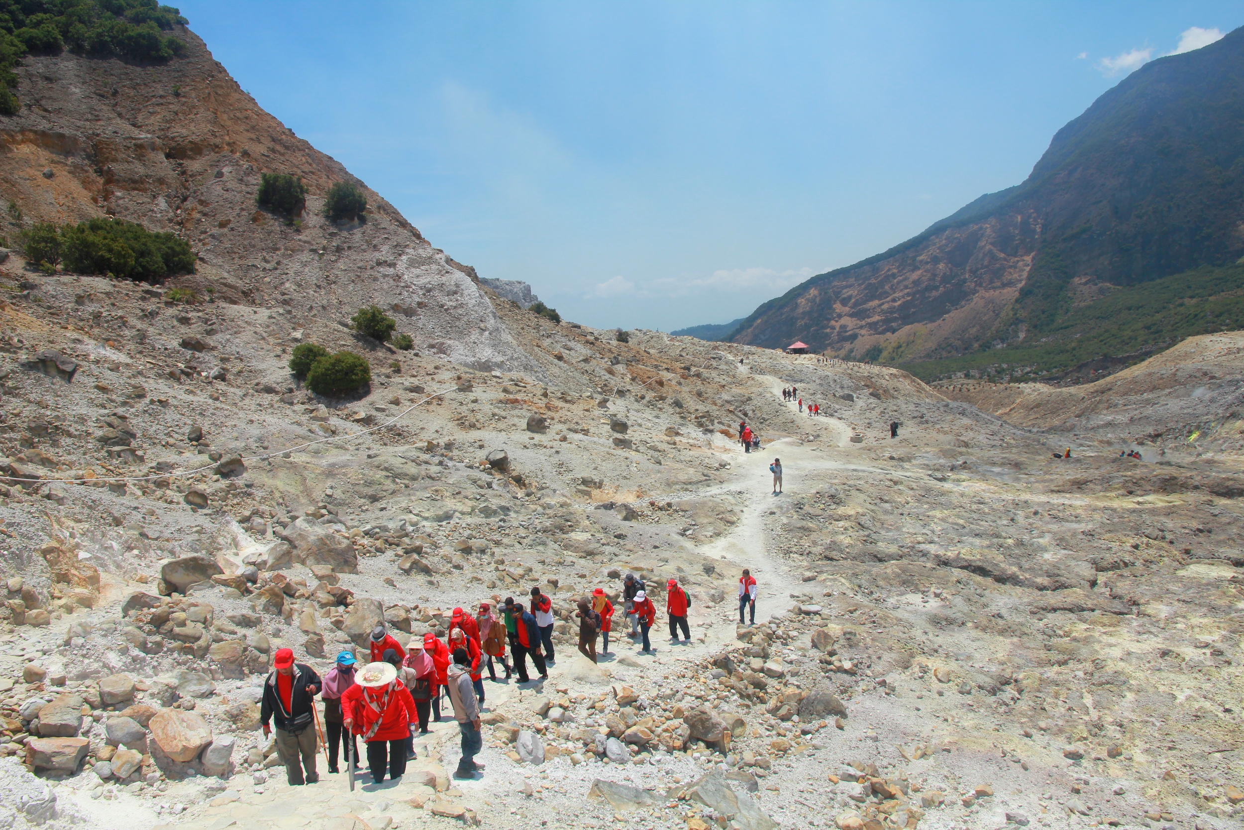Setelah puas berfoto-foto dan sarapan untuk bekal nanjak ke bumi perkemahan, kami pun mulai berkelompok untuk memulai perjalanan. Cuaca pagi itu begitu cerah dengan matahari bersinar hangat menyambut kami. Berbeda dengan gunung lain yang dari basecamp sudah mulai menanjak, Papandayan menawarkan jalur yang sangat landai. Saking landainya motor yang dimodifikasi layaknya motor trail itu bisa digunakan untuk membawa barang-barang ke atas.