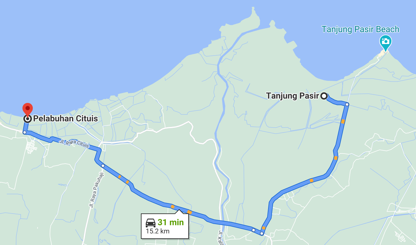 Pelabuhan Cituis berjarak sekitar 40 kilometer dari BSD, biasanya membutuhkan waktu sekitar 1,5 jam perjalanan. Jarak ini juga hampir sama bila berangkat dari Monumen Nasional, Jakarta.