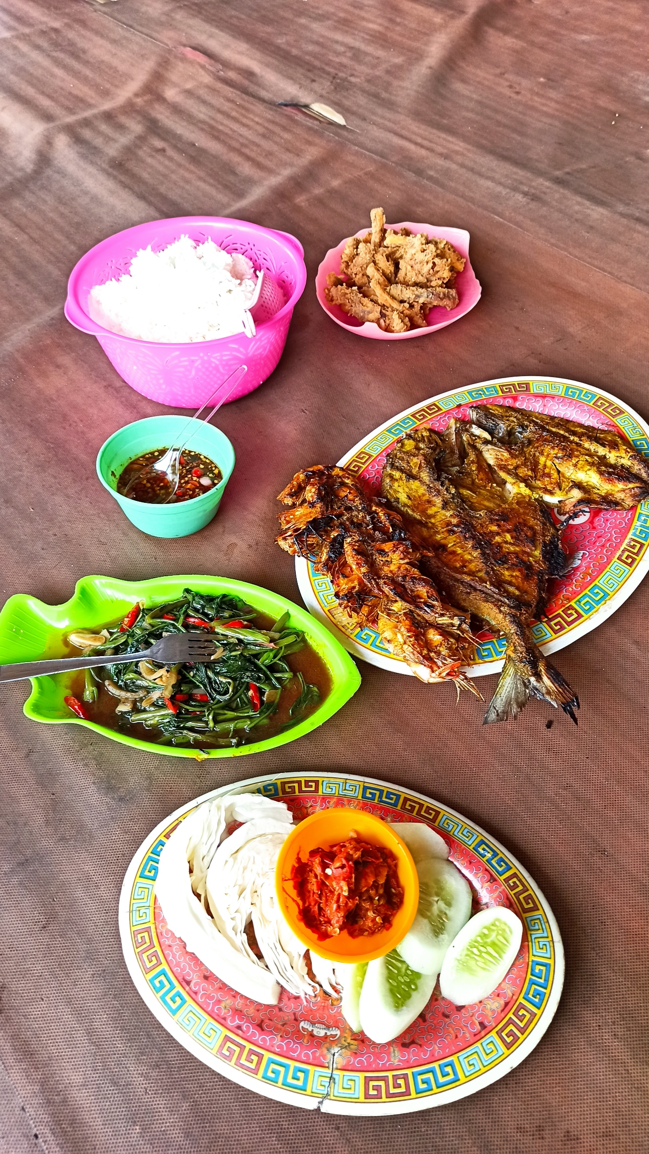 Oh ya, untuk menghindari hal-hal yang tidak diinginkan, saya minta bonnya dikeluarkan dulu. Agar sama-sama enak 🙂 Menu di atas, ikan bawal, udang, cumi, nasi, dan cah kangkung plus lima minuman, dibandrol 247 ribu rupiah.
